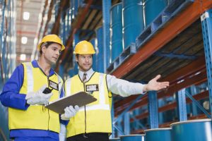 Workers with containers in warehouse